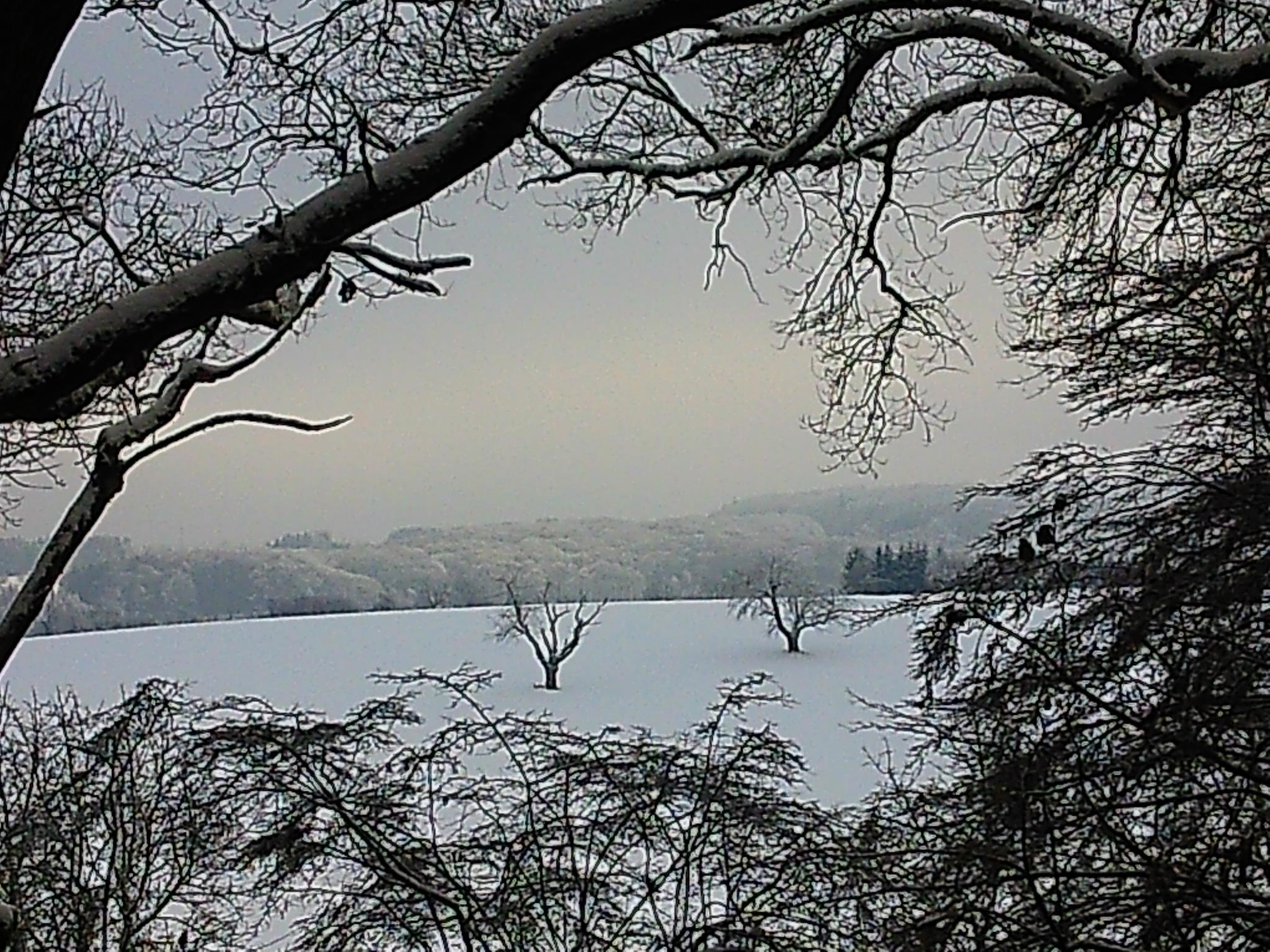 Hinter den durchsichtigen Winterkleidern der Bäume erträumt sich dein Blick ein blaues Land. Ein Land ohne festen Grund, ohne feste Konturen, das in der Ferne mit dem Horizont verschwimmt, grenzenlos.