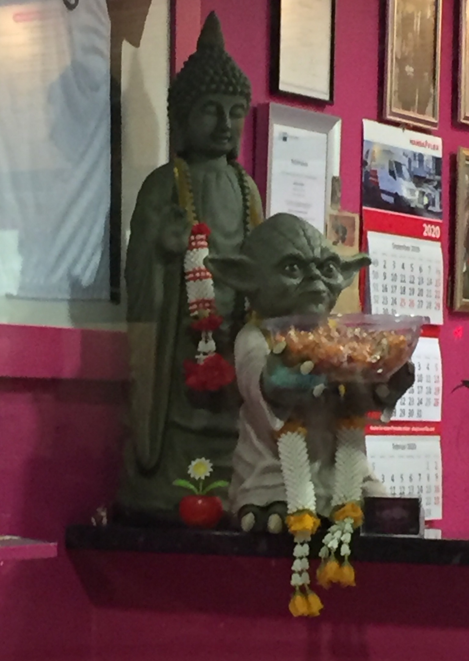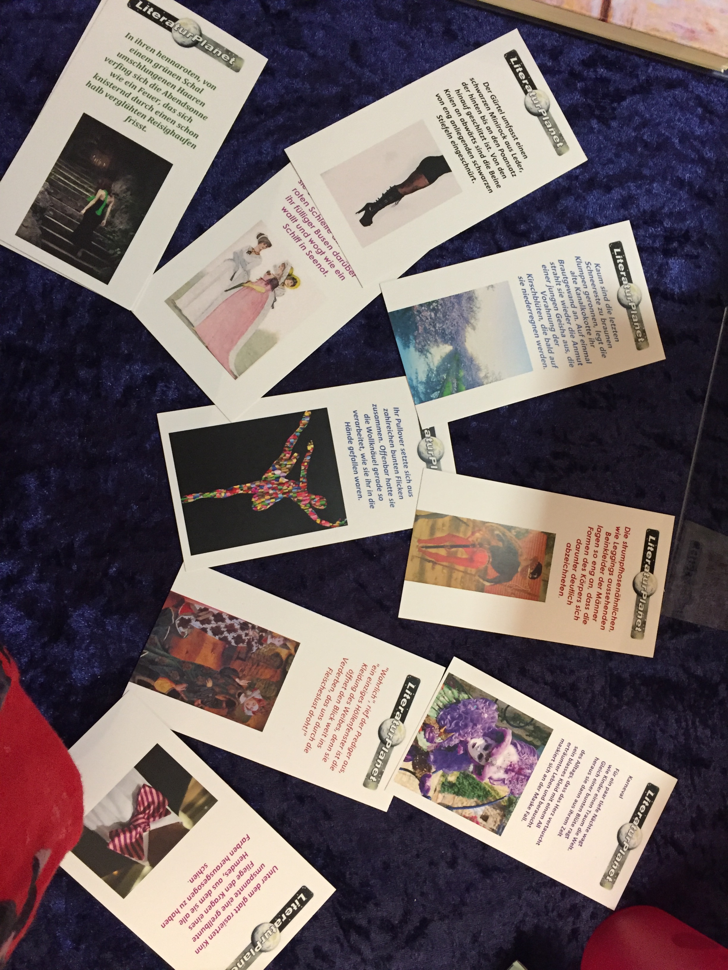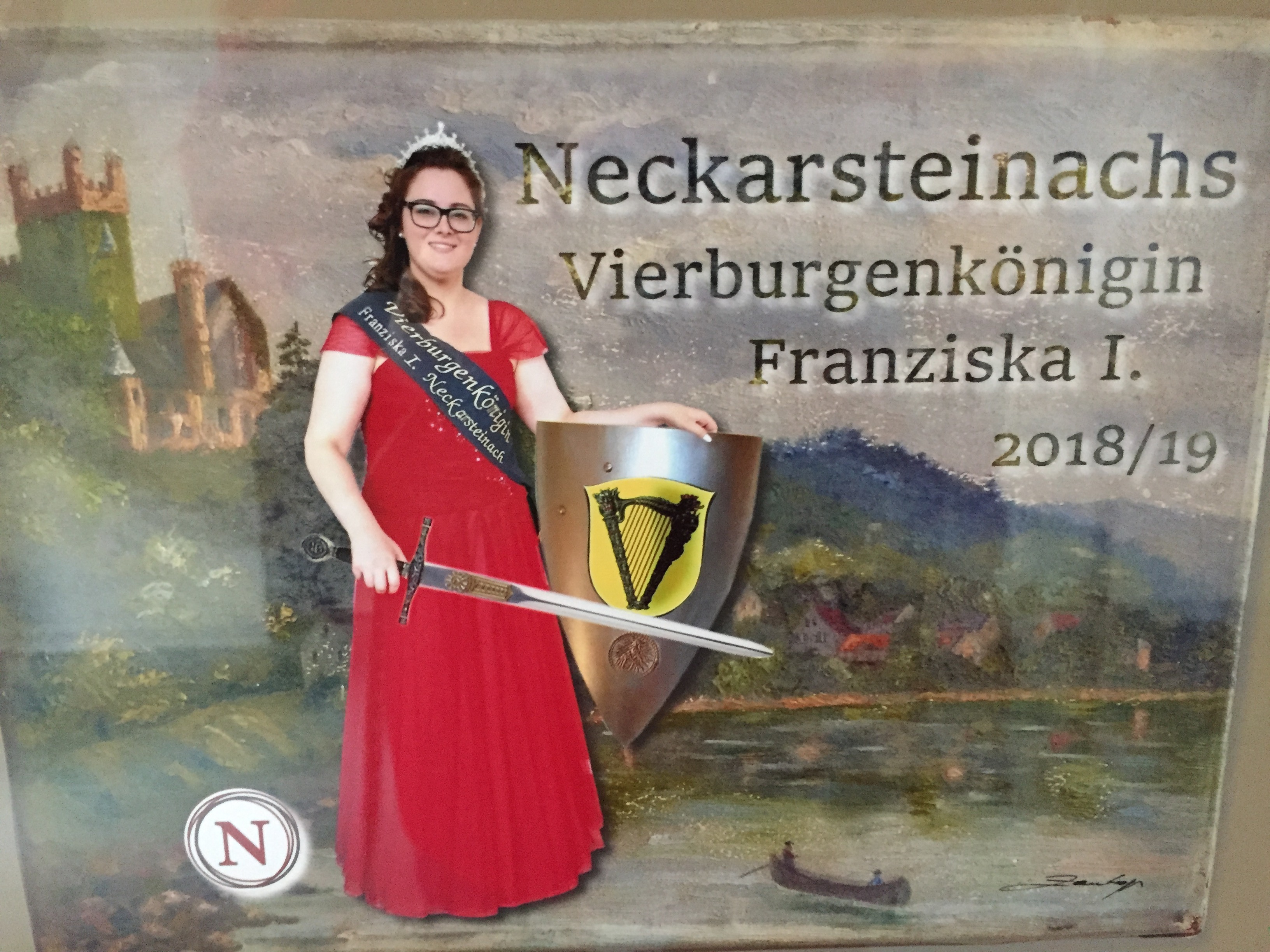 Fotos: 1. Der Verleger und künftige Organisator der „Kleinen Buchmesse“ Ulrich Wellhöfer übergibt dem Ehepaar Sauer einen Wanderstab. 2. Herr Dr. Sauer begrüßt die VerlegerInnen. 3. „Die Macht ist mit Euch.“ Meister Yoda im Asia-Imbiss in Neckarsteinach. 4. Die amtierende Vierburgenkönigin Franziska I. 5. Unser hölzerner Bücherfreund Carl. 6. Henny wartet auf die BücherfreundInnen. 7. Unsere neuen Lesezeichen.