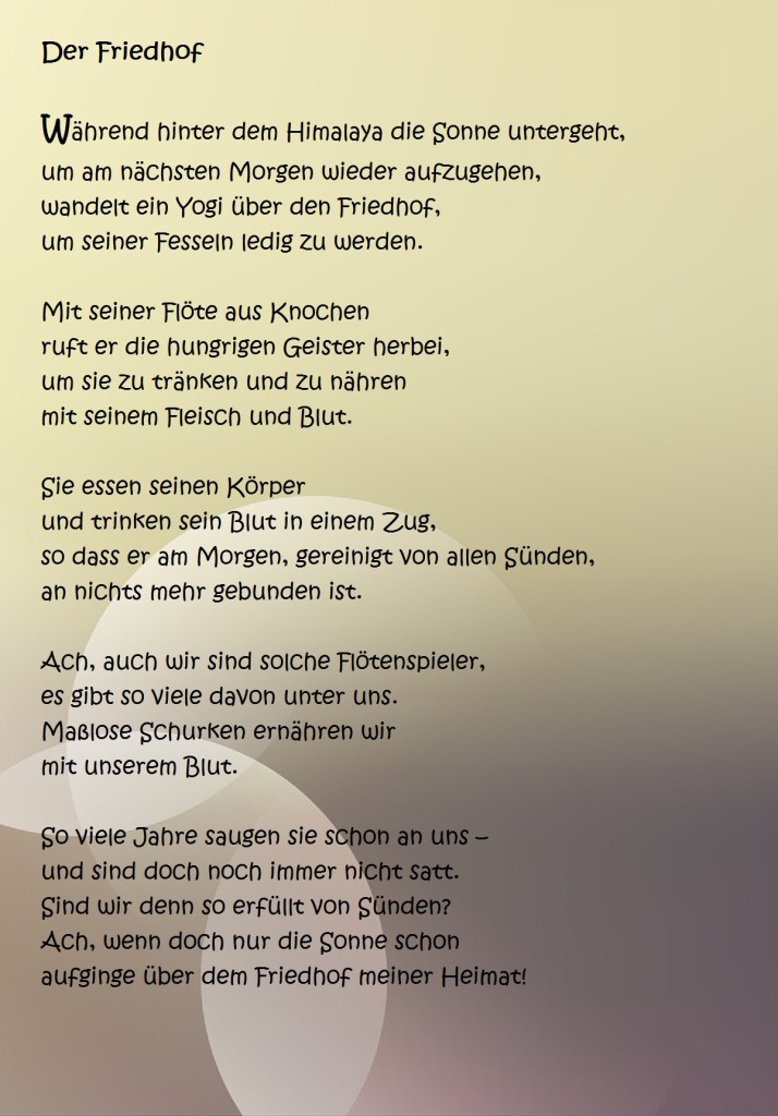 An diese Gedanken knüpft erkennbar auch der russische Dichter und Musiker Boris Grebenschtschikow – der sich seit Anfang der 1990er Jahre intensiv mit fernöstlichem Gedankengut beschäftigt – in seinem Lied Kladbischtsche (Friedhof) an. Es handelt von einem Yogi, der irgendwo im Himalaya mit einem Blasrohr aus Knochen hungrige Geister herbeiruft. Diese trinken daraufhin sein Blut und essen seinen Körper auf, so dass er, aller materiellen Fesseln ledig, frei wird für die Vereinigung mit dem Ganzen des Seins.