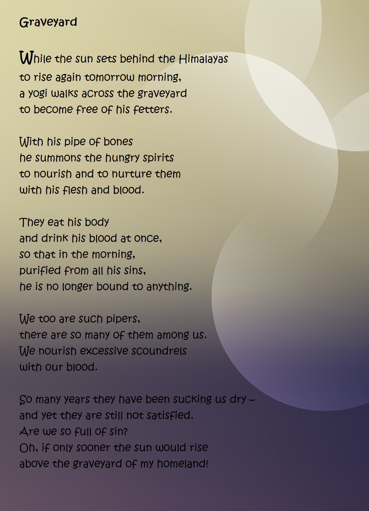 An diese Gedanken knüpft erkennbar auch der russische Dichter und Musiker Boris Grebenschtschikow – der sich seit Anfang der 1990er Jahre intensiv mit fernöstlichem Gedankengut beschäftigt – in seinem Lied Kladbischtsche (Friedhof) an. Es handelt von einem Yogi, der irgendwo im Himalaya mit einem Blasrohr aus Knochen hungrige Geister herbeiruft. Diese trinken daraufhin sein Blut und essen seinen Körper auf, so dass er, aller materiellen Fesseln ledig, frei wird für die Vereinigung mit dem Ganzen des Seins.