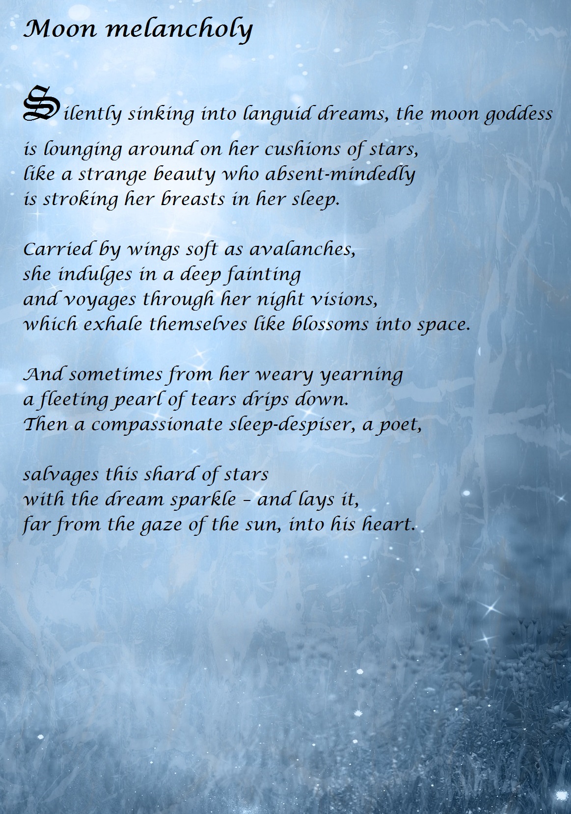 The poem captures this openness in the beautiful image of a poet who catches the tears of the moon goddess („the“ moon is female in French: „la“ lune) in his heart – and subsequently makes them blossom in poems. The goddess of the moon thus appears as the personification of the world of dreams and visions repressed in the everyday life of bourgeois society.