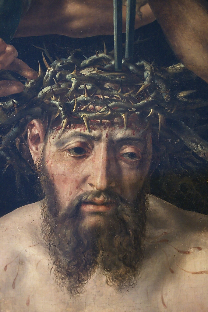 At that moment, something strange happens. All of a sudden you feel as if the sparse hair on the head of the martyred man began to glow. It looks like a crown, you think, yes, exactly, like a crown of thorns sparkling on the head.