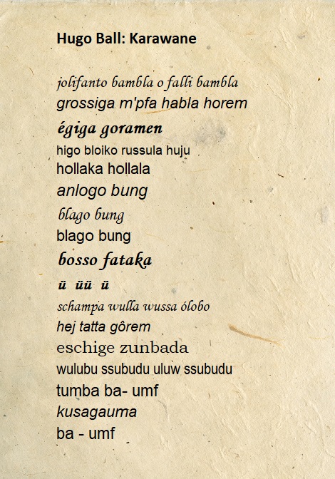 Hugo Ball: Karawane (1916); aus: Gesammelte Gedichte, p. 28. Zurich 1963: Arche.