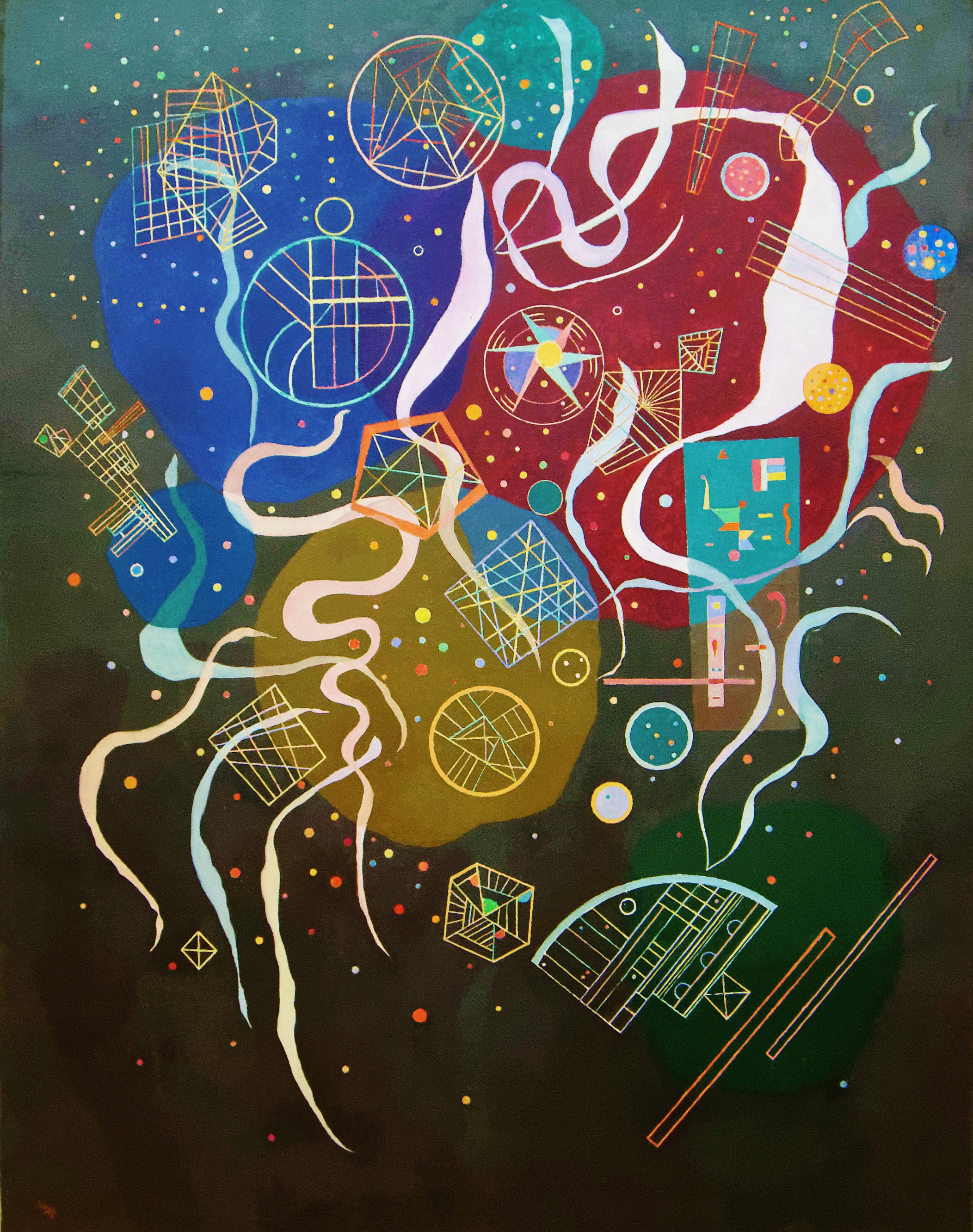 Bilder / Images: Wassily Kandinsky (1866 – 1944): Bewegung 1 / Movement 1; Moskau, Tretjakow-Galerie (Wikimedia commons);Hugo Ball auf einer Einladungskarte für das Cabaret Voltaire/Hugo Ball on an invitation card for the Cabaret Voltaire , 1916 (Wikimedia commons); Porträtfoto / Portrait photo von Hugo Ball, 1916 (Wikimedia commons)