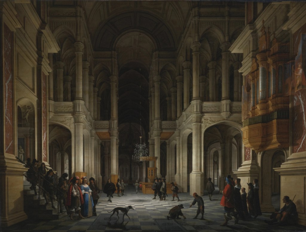 Bilder / Images: Anthonie de Lorme (circa 1610 –1673): 1. Innenraum einer Kirche mit galanten Gestalten (1632); Wikimedia commons / Church interior with elegant figures (1632); Wikimedia Commons; 2. Anthonie Palamedesz: (1602 – 1673; Figuren): Innenraum einer Renaissancekirche mit Einzug eines galanten Paares (Wikiemedia commons) / Anthonie Palamedesz: (1602 – 1673; characters): Interior of a Renaissance-style church at night with an elegant couple making an entrance (Wikimedia Commons)