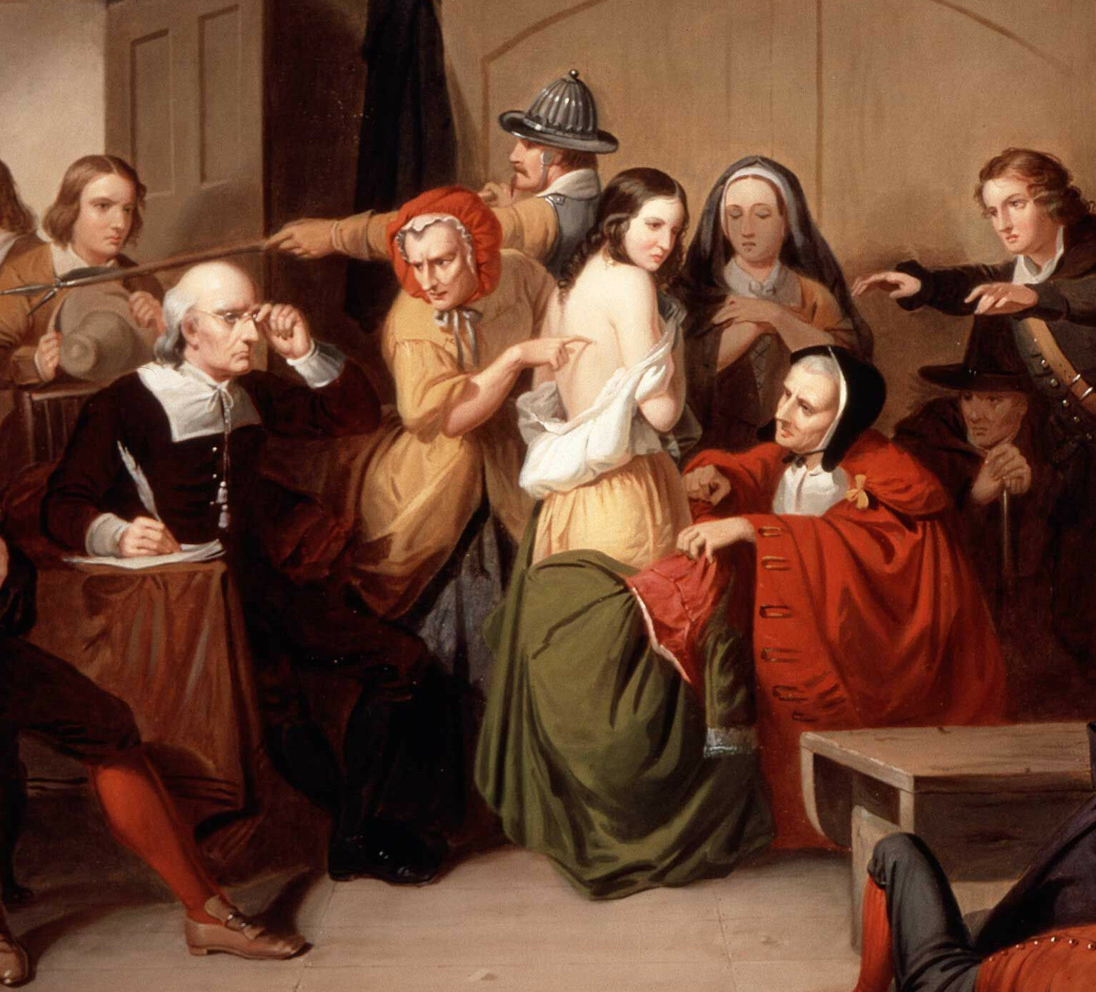 Bilder /Images: Tompkins Harrison Matteson (1813 – 1884): Untersuchung einer Frau auf ein Hexenmal / Examination of a woman for a witch’s mark (1853; Ausschnitt / detail); Peabody Essex Museum, Salem, Massachusetts (Wikimedia commons); Efes: Frau mit feuerroten Haaren / Woman with fiery red hair (Pixabay)