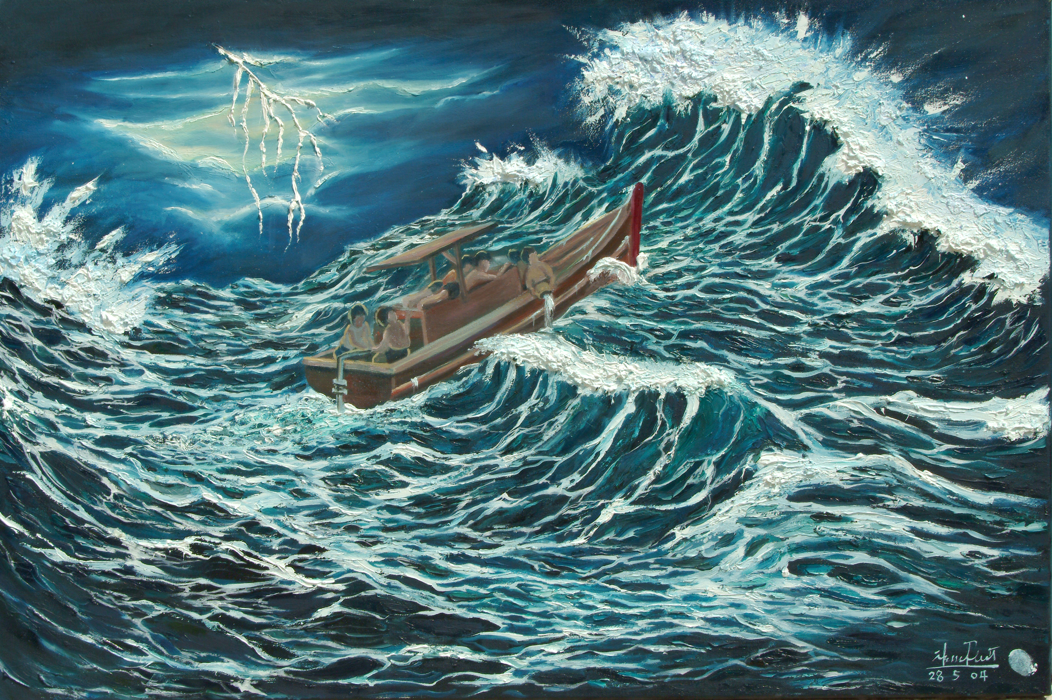Lat Yip: Flucht über das wogende Meer; Zeichnung mit Bildunterschrift: Für drei Mahlzeiten und die Freiheit habe ich meine Familie und Freunden Tausende von Meilen hinter mir gelassen und bin schließlich in Malaysia gelandet. Alles in der Hoffnung auf Freiheit (Wikimedia commons, August 2004).Lat Yip: Escape to the raging seas; painting with caption: For three meals and freedom I left my family and friends behind Thousands of miles to finally reach Malaysia. All for the hope of freedom (Wikimedia Commons, August 2004); Gunnar Wrobel: Kari Bremnes (2008); Wikimedia commons
