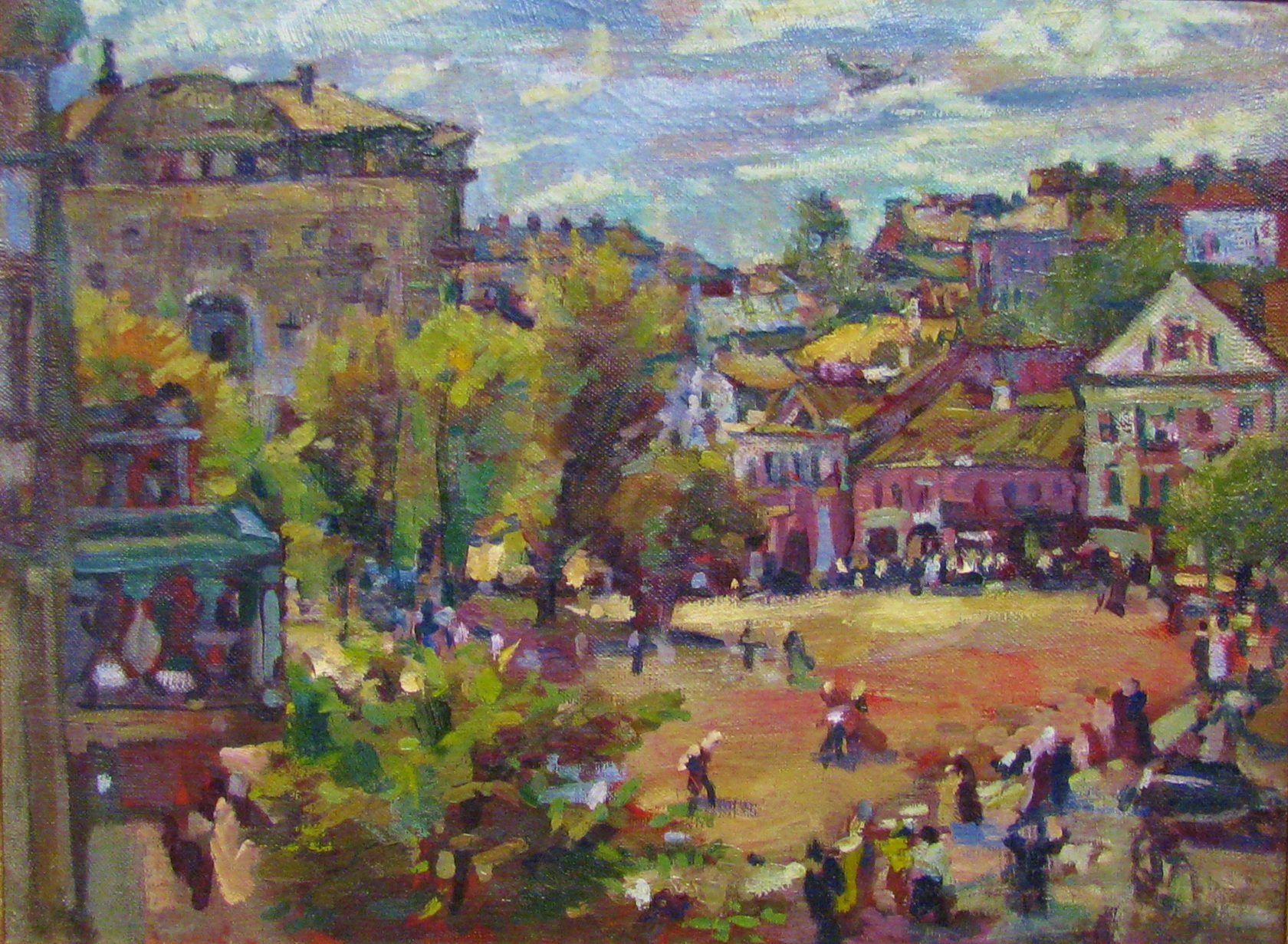 Bilder: Мікалай Тарасікаў (Mikalaj Tarassikai, 1908 – 1965): Der Freiheitsplatz in Minsk (1940); Wikimedia commons; Maciek Krol: Die Band N.R.M. bei dem Konzert „Rock for Freedom“ in Wrocław (Breslau), 2007 (Wikimedia commons)