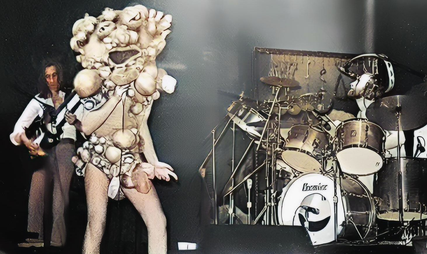 Bild: Tony Morelli: Peter Gabriel als „Slipperman“ – einer der surrealen Figuren aus The Lamb Lies Down on Broadway – während eines Auftritts im Chicagoer Auditorium Theatre am 20. November 1974; links Mike Rutherford, rechts Phil Collins (Wikimedia commons)